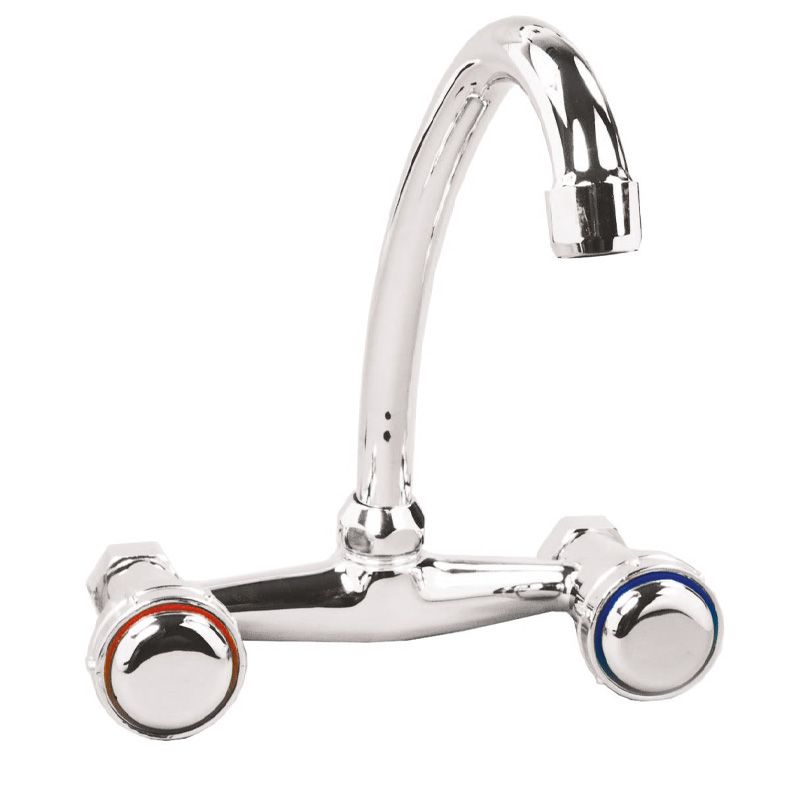 Kitchen Mixer Tap with a chrome finish, wall mounted with high neck and swivel spout design.